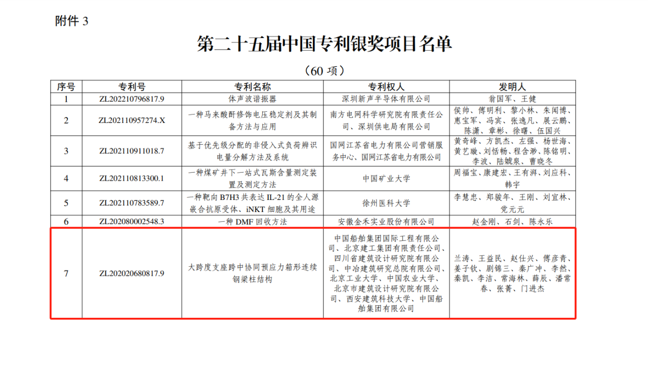 今年6月,國(guó)家知識(shí)產(chǎn)權(quán)局公布第二十五屆中國(guó)專利獎(jiǎng)授獎(jiǎng)決定,由中船集團(tuán)旗下中船國(guó)際工程主導(dǎo)申報(bào)的專利《大跨度支座跨中協(xié)同預(yù)應(yīng)力箱形連續(xù)鋼梁柱結(jié)構(gòu)》(專利號(hào):ZL202020680817.9)榮獲本屆中國(guó)專利銀獎(jiǎng)。該獎(jiǎng)項(xiàng)由國(guó)家知識(shí)產(chǎn)權(quán)局與世界知識(shí)產(chǎn)權(quán)組織聯(lián)合設(shè)立,是我國(guó)專利領(lǐng)域的最高榮譽(yù)。今天,讓我們走進(jìn)中船國(guó)際工程鋼結(jié)構(gòu)工程設(shè)計(jì)與研發(fā)團(tuán)隊(duì),聆聽(tīng)他們的奮斗故事。