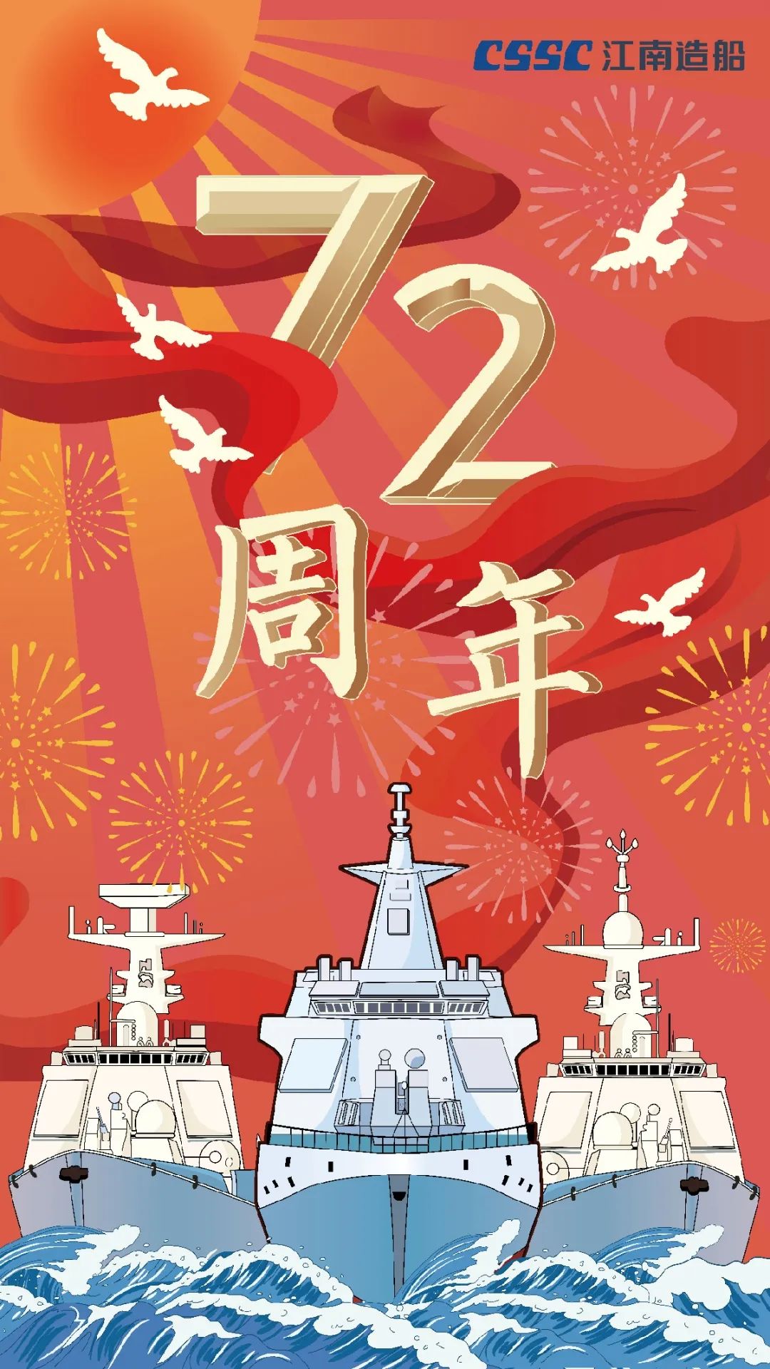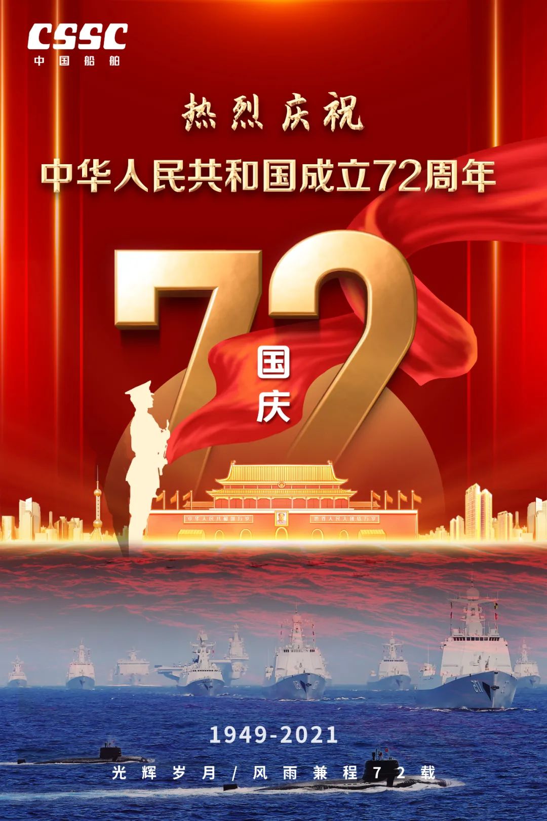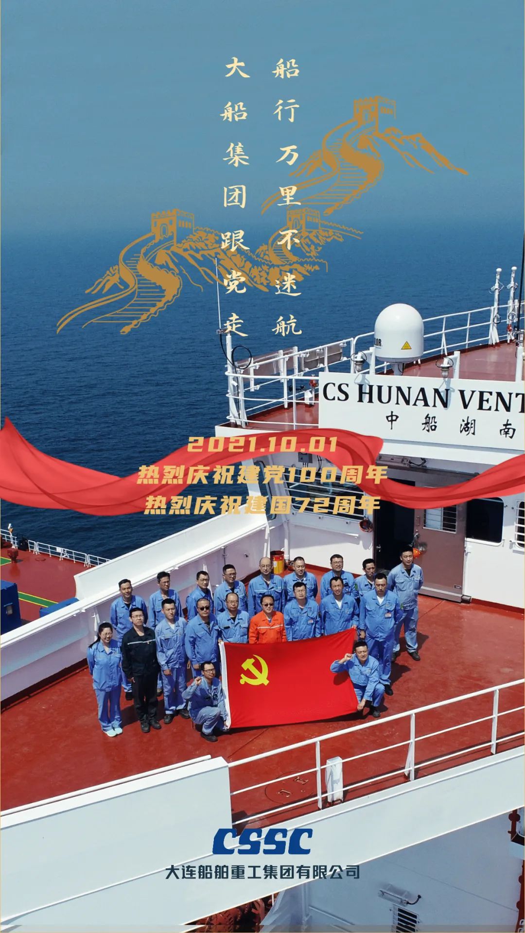 今天,我們迎來新中國(guó)72周年華誕。作為我國(guó)海軍裝備建設(shè)的主力軍,中國(guó)船舶大船集團(tuán)將不忘初心,牢記使命,堅(jiān)定貫徹海洋強(qiáng)國(guó)、制造強(qiáng)國(guó)、科技強(qiáng)國(guó)國(guó)家戰(zhàn)略,聚焦主責(zé)主業(yè)、聚力興裝強(qiáng)軍,為實(shí)現(xiàn)中華民族偉大復(fù)興的中國(guó)夢(mèng)而不懈奮斗。