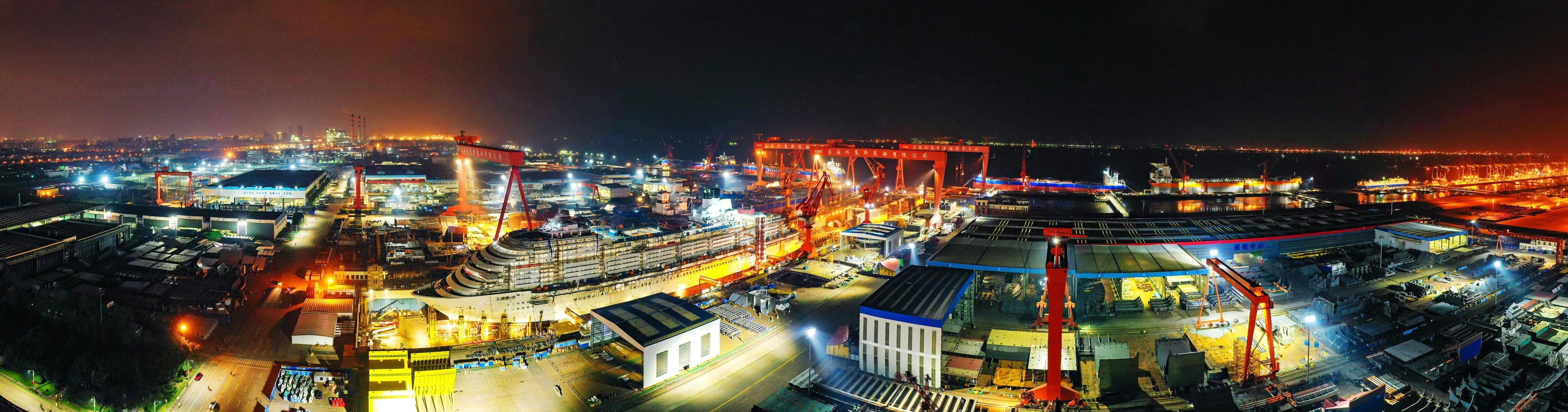 十月金秋結碩果,外高橋造船提前兩個半月完成了2021年度交船19艘/座的生產任務,燈火通明的廠區超廣角視圖充分體現了外高橋造船人持續保障大型郵輪項目高效運行,努力完成民船、海工、郵輪產品的設計建造任務、爭取以超額完成全年目標的決心和信心。