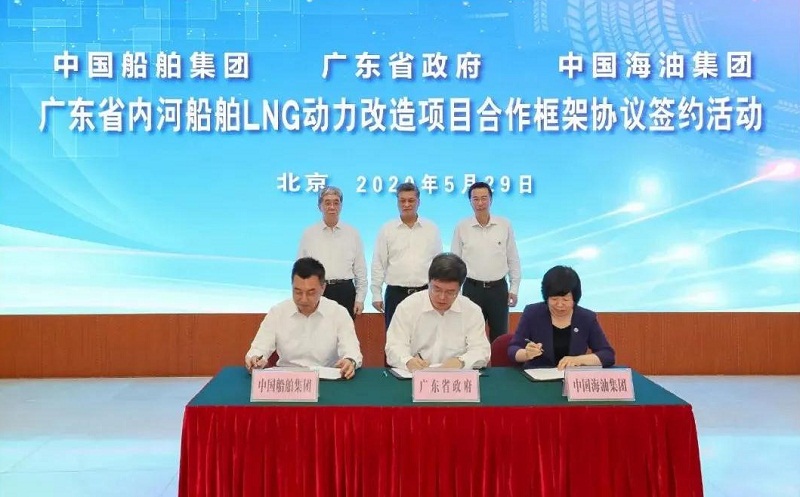 ????5月29日,中國船舶集團有限公司與廣東省人民政府、中國海洋石油有限公司在京簽署《廣東省內河船舶LNG動力改造項目合作框架協議》。廣東省委副書記、省長馬興瑞,中國船舶集團黨組書記、董事長雷凡培,中國海油黨組書記、董事長汪東進,中國船舶集團黨組成員、副總經理杜剛,中國海油黨組成員、副總經理陳壁出席簽約儀式。廣東省副省長覃偉中,中國船舶集團黨組成員、副總經理孫偉,中國海油黨組成員、總會計師溫冬芬分別代表各方在協議上簽字。