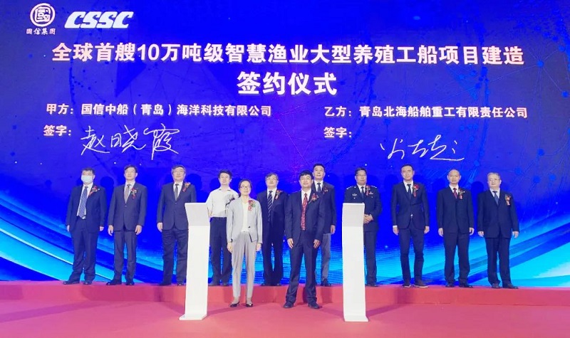 ????6月3日,中國船舶集團有限公司旗下武船集團青島北海船舶重工有限責任公司與國信中船(青島)海洋科技有限公司在青島西海新區正式簽署全球首艘10萬噸級智慧漁業大型養殖工船的建造合同。本次簽約標志著養殖工船項目正式進入實質性建造階段,該船將于2022年3月交付。中國船舶集團黨組成員、副總經理孫偉,青島市副市長耿濤等領導和嘉賓出席簽約儀式。