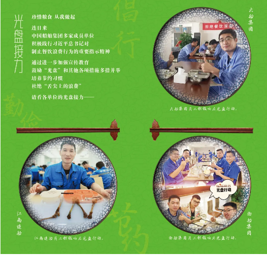 中國船舶集團多家成員單位積極踐行習近平總書記關于制止餐飲浪費行為的重要指示精神,通過進一步加強宣傳教育,鼓勵“光盤”和其他各項措施多措并舉,培養節約習慣,杜絕“舌尖上的浪費”,請看各單位的光盤接力。