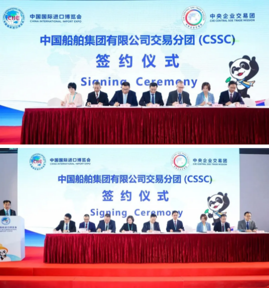 11月6日上午,中國船舶集團舉行第三屆進博會國資委中央企業交易團集中簽約儀式,中國船舶集團所屬7家企業與19家合作商進行了23個項目簽約,簽約總金額共計1.14億美元。中國船舶集團黨組成員、副總經理錢建平參加簽約儀式。