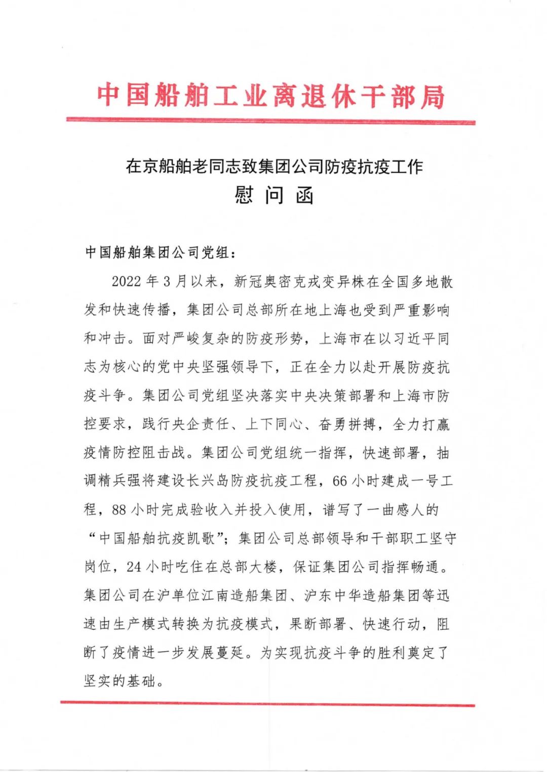 抗疫形勢嚴(yán)峻復(fù)雜,中國船舶集團(tuán)離退休老領(lǐng)導(dǎo)老同志關(guān)注抗疫、心系集團(tuán),為干部職工加油鼓勁。