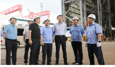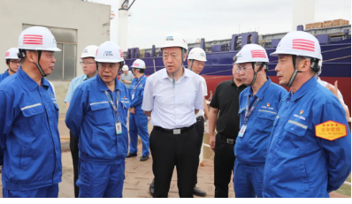 6月8日下午、9日上午,在龍穴基地調研期間,溫剛走進造修船生產現場,登上多型重點在建船舶,察看車間、船塢、船臺等生產區域,與企業班子成員深入交流,聽取了黃埔文沖、廣船國際產業發展、深化改革、科技創新、人才隊伍建設、精益管理、黨的建設等有關情況的匯報。