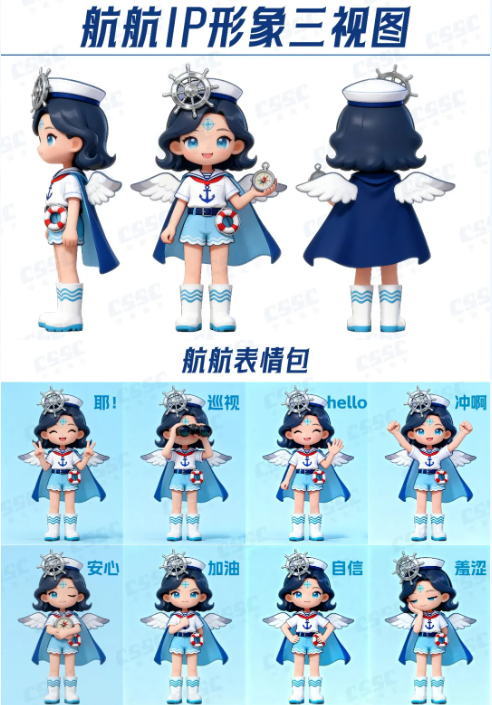 建建(造船擔當)以銀色防護頭盔(嵌船舶零件電子屏、印艦船剪影)、船錨腰帶、CSSC工裝及焊槍,凸顯造船匠心精神;航航(航行擔當)憑船舵頭飾、導(dǎo)航羅盤、海鷗披風(fēng)與船錨上衣,傳遞中船航行使命。二者以 “建造 - 航行” 閉環(huán),具象中船全鏈條實力,彰顯中船文化。