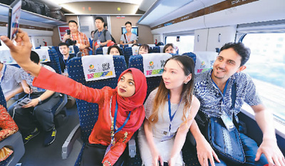 6月17日,100余名留學生從西安出發,乘坐寶蘭高鐵試運行動車組前往蘭州,初次體驗即將開通運營的首條貫通新絲路高鐵。圖為幾名外國留學生在動車組試驗列車上自拍。唐振江攝(人民視覺)