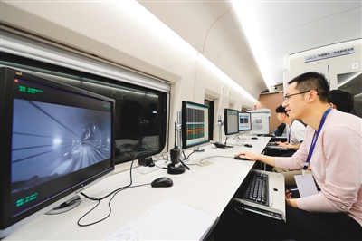 6月20日,西(安)成(都)高鐵陜西段聯調聯試正式啟動。圖為當高速綜合檢測列車穿越秦嶺時,技術人員在監測列車運行數據。新華社記者 李一博攝