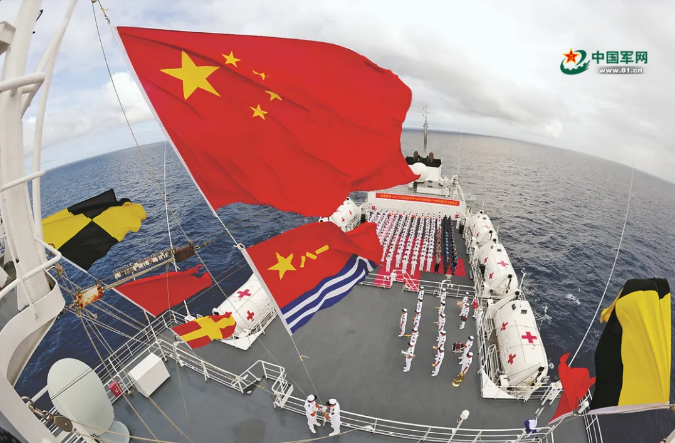 “和平方舟”號醫院船在大洋上舉行隆重升旗儀式。來源:中國軍網 江 山攝