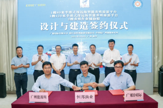 5月8日,中國船舶集團旗下廣船國際 與廣東省陽江市恒邦漁業有限公司簽訂1艘80米半潛式深遠海智能養殖旅游平臺建造合同,這是廣東省首個商業化大型半潛式養殖旅游綜合平臺。