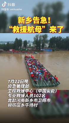 7月24日1時許,進占道路具備重型裝備通行條件,石料也已準(zhǔn)備到位,決口封堵戰(zhàn)正式打響。在封堵現(xiàn)場,前一天在新鄉(xiāng)轉(zhuǎn)移被困群眾時立下頭功、被稱作“救援航母”的應(yīng)急動力舟橋再次出現(xiàn)。