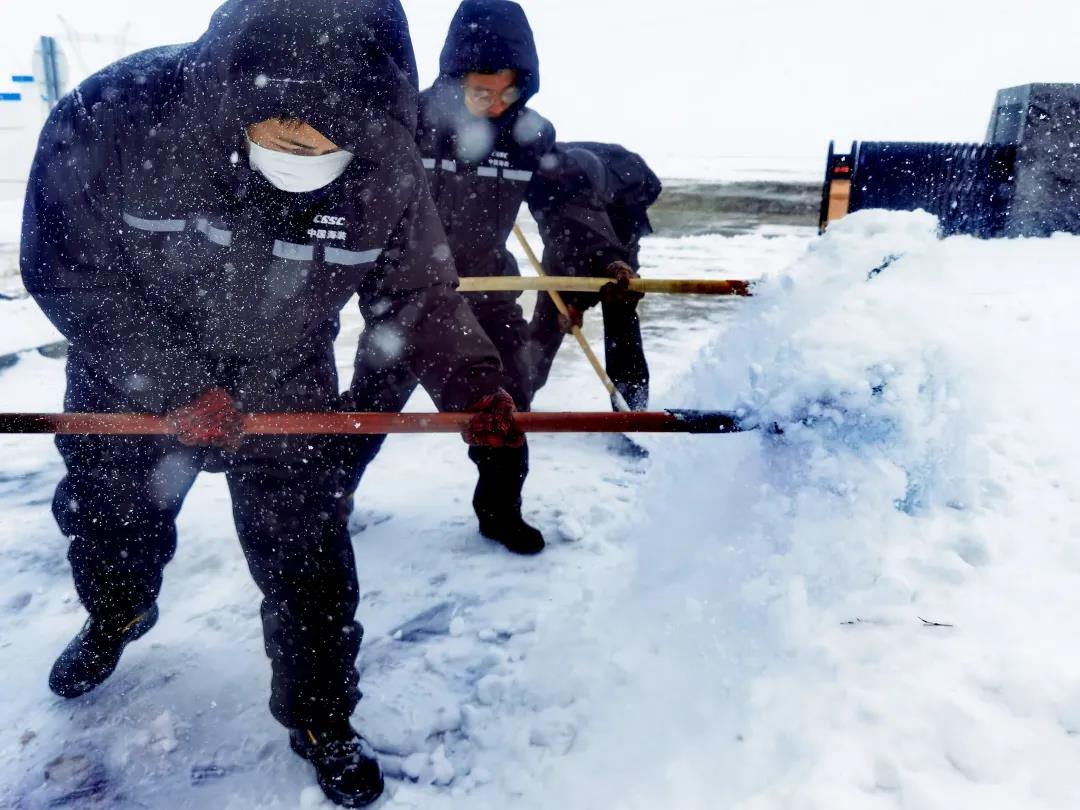 進入11月,內蒙古自治區錫林郭勒盟地區迎來大面積的暴風雪,烏達萊項目人員在趕往風場的路上遭遇積雪路段,雖然氣候嚴寒,但為了及時消除機組故障,大家在積雪路段采取挖雪推車的方式齊心協力,一同開展清理路面積雪的行動。這個冬日,冰雪阻擋不住海裝追風者們勇往直前的步伐,他們只為恪盡職守完成一個承諾——風機旋轉、帶來光熱。