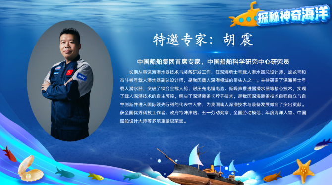 3月22日,由山東省大中小學(xué)海洋文化教育研究指導(dǎo)中心、中國(guó)海洋大學(xué)等單位聯(lián)合主辦的“探秘神奇海洋”云端科普活動(dòng)的重點(diǎn)板塊之一——“深海探索”直播正式開播。中國(guó)船舶集團(tuán)首席專家、中國(guó)船舶集團(tuán)七〇二所研究員胡震在直播間為廣大觀眾答疑解惑,近6萬名觀眾觀看直播并提出了各類關(guān)于深海的問題。