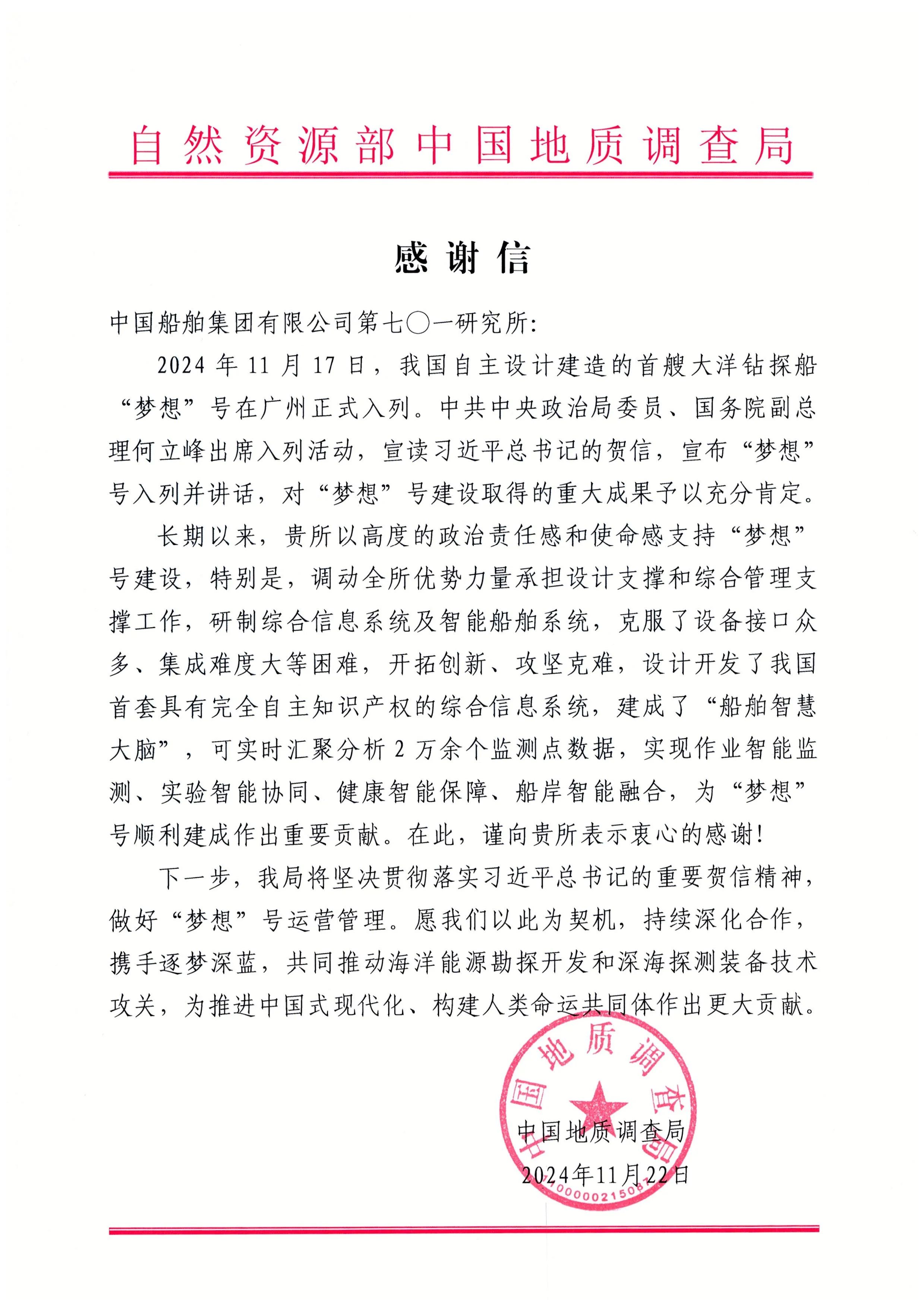 中國地質調查局在信中對中國船舶集團七〇八所在“夢想”號立項論證、研發設計、建造調試等階段所做的突出工作和卓越貢獻表示感謝。