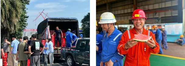 廣船國際始終將員工身心健康與安全生產放在首位,用科學調度、貼心保障的“組合拳”,撐起“清涼保護傘”。該公司向全體工會會員發放慰問清涼飲料,做好防暑降溫工作,保障員工健康;所屬文沖修造常態化開展“送清涼”活動,各部門自發熬煮糖水、派發西瓜,讓“清涼”直抵崗位、暖到心間。