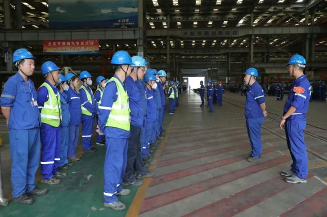 武昌造船、中船澄西、中船物資、中船動力和汾西重工等單位按照“五步法”召開班前會,確認人員狀態及勞保防護裝備;分享安全案例,剖析隱患;細化工作任務,標注風險,明確應急流程;隨機抽查復述,組員互查要點;全員齊喊安全或精益口號,提振士氣。