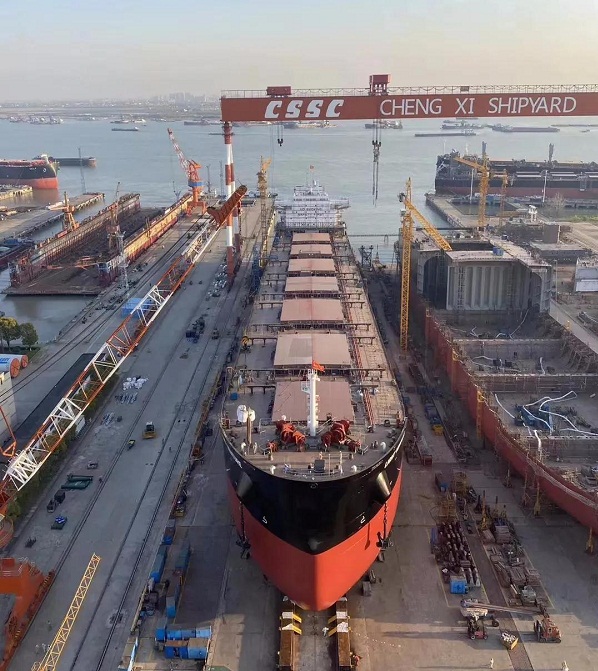 ????4月7日,中國船舶集團旗下中船澄西為香港華光船務建造的42號8.2萬噸散貨船,在中船澄西揚州公司下水。該船下水整體完整性較好,船體工程、輪機工程、電氣工程等多項工程基本完工,為水下全船設備安裝調試打下了堅實基礎。