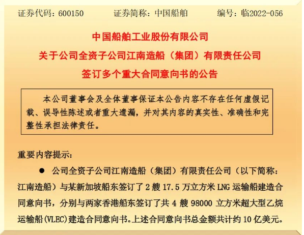 10月25日,中國船舶集團有限公司旗下上市公司中國船舶工業(yè)股份有限公司發(fā)布《關(guān)于公司全資子公司江南造船(集團)有限責任公司簽訂多個重大合同意向書》的公告。根據(jù)公告,江南造船共與相關(guān)船東簽署了2型6艘約10億美元新船建造合同意向書。