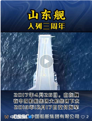 山東艦是我國(guó)第二艘航空母艦,也是我國(guó)自主設(shè)計(jì)、自主配套、自主建造的首艘航母。2017年4月26日,山東艦在素有“海軍艦艇搖籃”美譽(yù)的中國(guó)船舶集團(tuán)旗下大船集團(tuán)碼頭下水,自此揭開了中國(guó)雙航母時(shí)代篇章。