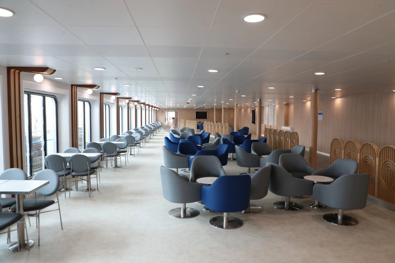 另外,該船還配有完整的隔離病房及防疫區等,空調通風也進行了特殊設計,具備完善的生物安全應對措施,是國內建造的首艘取得全球最新的biosafe生物安全入級符號的豪華客滾船。